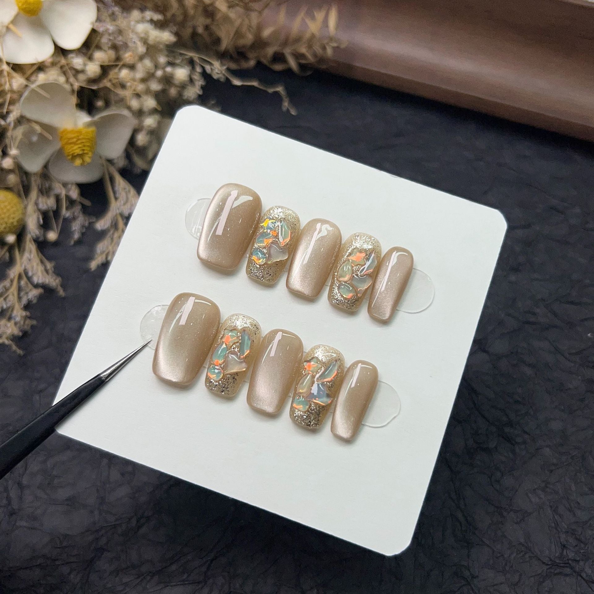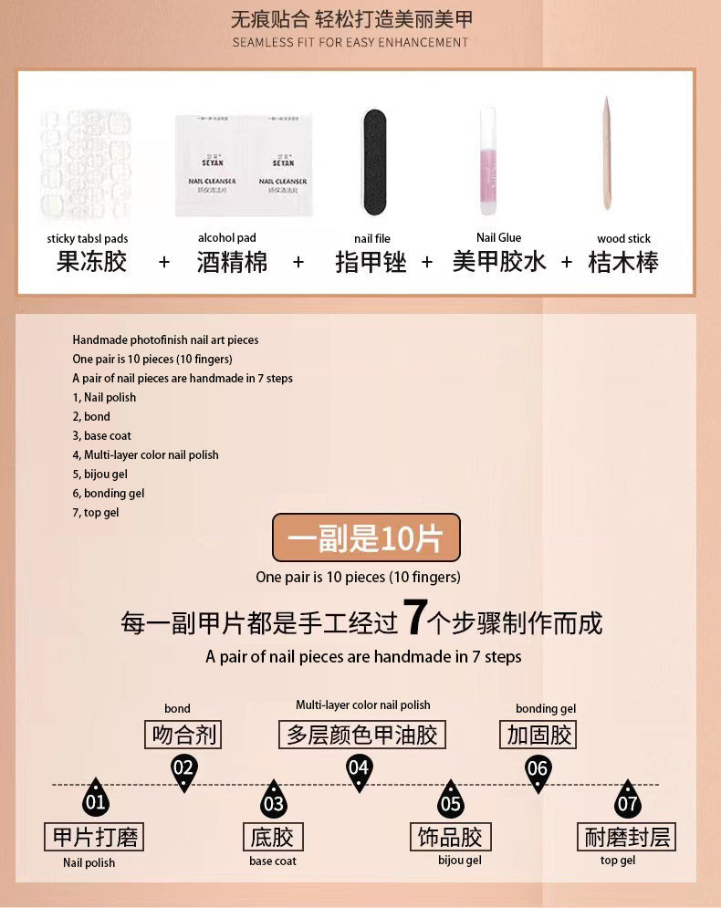 5, place the sticky tab on your nail and then press the press on nails down starting from the cuticle and working towards the tip press for 30 second.